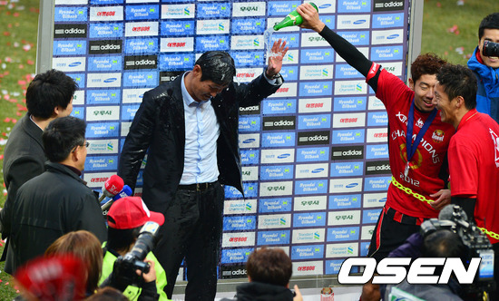 경기후 하대성 김진규과 인터뷰중인 서울 최용수 감독에게 샴페인을 뿌리고 있다./jpnews@osen.co.kr