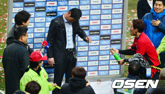 경기후 서울 하대성이 인터뷰중인 최용수 감독에게 샴페인을 뿌리고 있다./jpnews@osen.co.kr