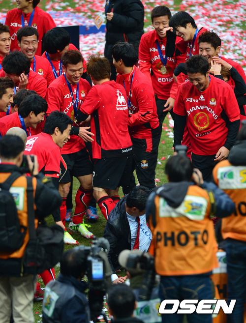 경기후 서울 최용수 감독이 선수단에 헹가래를 받고 그라운드에 넘어져 있다./jpnews@osen.co.kr