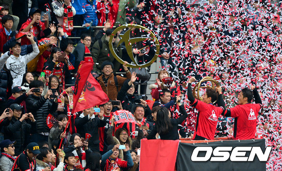 경기후 서울 하대성 김진규가 리프트를 타고 서포터즈를 우승의 기쁨을 나누고 있다./jpnews@osen.co.kr