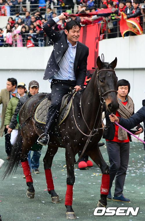 지난 21일 제주 유나이티드전 승리로 우승을 확정지은 서울은 우승 시상식과 세리머니를 이날로 미루었다. 그만큼 화끈한 세리머니가 펼쳐졌다. 그 중 하나는 최용수 감독의 승마 세리머니. 최용수 감독은 말에 직접 올라 넥타이를 흔들고 말춤을 추며 팬들이 집결해 있는 N석 앞을 지나갔다.