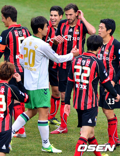 경기후 전북 이동국이 서울 현영민과 인사를 나누고 있다./jpnews@osen.co.kr