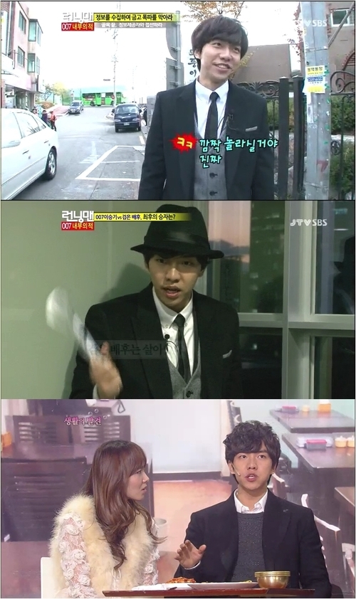 이승기는 ‘런닝맨’에서 금괴 폭발을 막고 내부 적을 색출해야 하는 007요원으로 변신했다. 그는 명석한 두뇌로 기억력 게임에서 두각을 드러낸 것 외에는 다소 부족한 설득력으로 인한 미션 실패, 천연덕스럽게 거짓말을 하지 못해 다른 멤버들에게 정보가 들키는 등의 허당 매력으로 시청자들에게 큰 웃음을 선물했다.