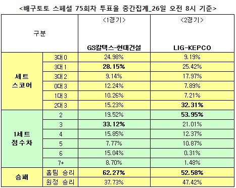 [배구토토] 국민체육진흥공단(www.kspo.or.kr)이 발행하는 체육진흥투표권 수탁사업자인 스포츠토토 공식 온라인 발매사이트 베트맨(www.betman.co.kr)이 오는 27일 열리는 2012-13시즌 국내프로배구(V리그)를 대상으로 한 배구토토 스페셜 75회차 투표율 중간집계 결과, 국내 배구팬 62.27%는 GS칼텍스-현대건설(1경기)전에서 홈팀 GS칼텍스의 승리를 전망했다고 밝혔다.