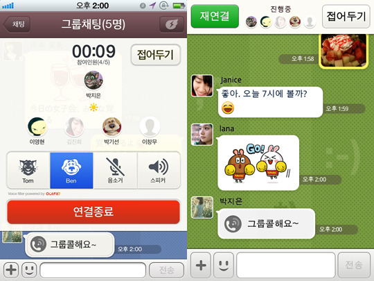 그룹콜은 보이스톡과 마찬가지로 mVoIP 기반 고품질 HD 보이스를 지원한다. 또한 여러 명이 동시에 톰, 벤 목소리로 음성 채팅을 할 수 있는 그룹 보이스필터 기능도 탑재해 모바일 커뮤니케이션의 새로운 경험과 즐거움을 선사할 것으로 기대된다.