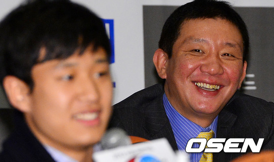 KCC 허재 감독이 아들인 연세대 허웅의 답변을 듣고 웃음을 터뜨리고 있다.