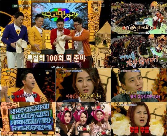 시청자가 주인이 된 KBS 2TV 예능프로그램 '안녕하세요'가 어느덧 100회를 맞은 가운데, 특집 방송마저 본연의 자세를 잃지 않고 일반인 고민 해결에 집중하는 모습을 보여 시청자들의 많은 박수를 받았다.