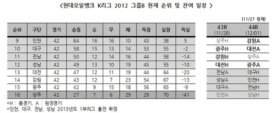 비운의 강등을 당할 후보로 대전 시티즌(승점 47)과 강원 FC(승점 43), 광주 FC(승점 42)로 좁혀졌다.