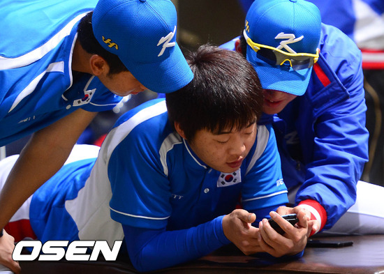 27일 오전 대만 타이중 인터컨티넨탈구장 락커룸에서 아시아야구선수권대회 대표팀 정인욱이 동료들과 스마트폰을 보고 있다.