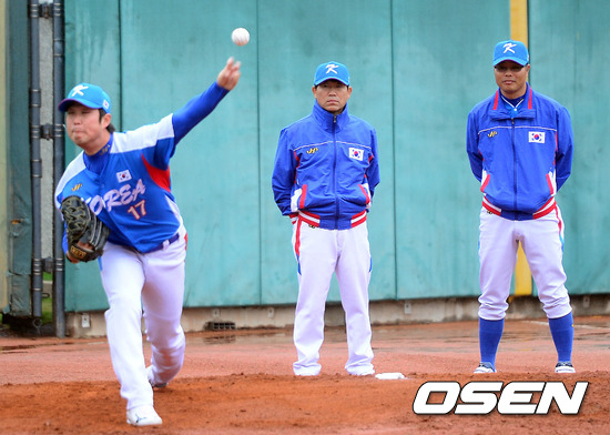 27일 오전 대만 타이중 인터컨티넨탈구장에서 아시아야구선수권대회 대표팀 이연수 감독과 이상번 코치가 윤근영의 피칭을 바라보고 있다.