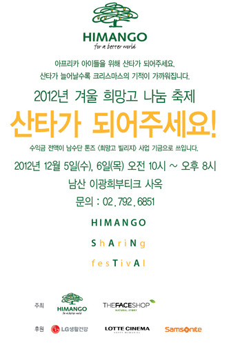 사단법인 희망의 망고나무가 12월 5일~6일 양일간 남산 이광희 부티크 사옥에서 2012 희망고 나눔 축제인 ‘산타가 되어주세요’를 추최한다.