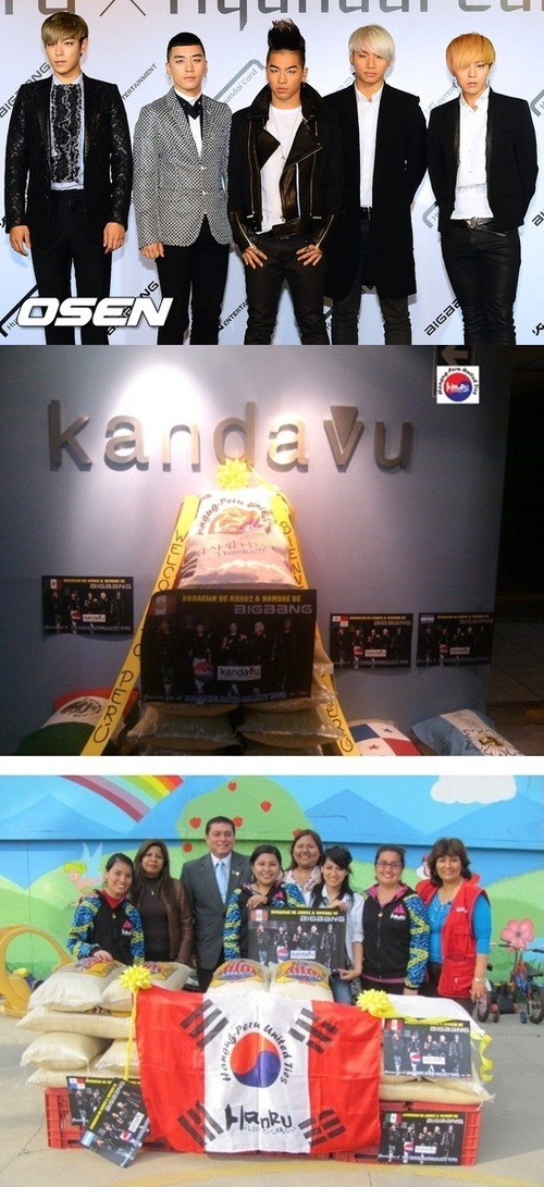 해외 유명 K팝 뉴스 사이트인 K팝스타즈는 지난 26일(한국 시간) 이같이 밝히며 "페루에 거주하는 빅뱅의 팬들이 빅뱅의 이름으로 쌀을 기부했다. 이는 빅뱅이 지난 14일 현지에 콘서트차 방문한 것을 기념해 이뤄진 일"이라고 밝혔다.