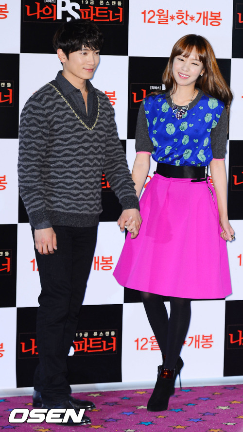 27일 오후 서울 용산 CGV에서 열린 영화 ‘나의 PS 파트너’ 시사회에서 포토타임 중 지성과 김아중이 손을 잡고 있다.