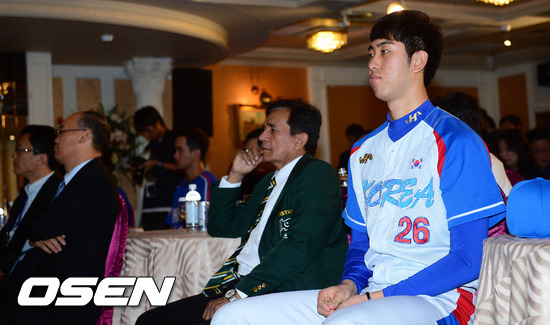 27일 오후 대만 타이중 시내의 한 호텔에서 열린 아시아야구선수권대회 기자회견에 김민수가 참석하고 있다.
