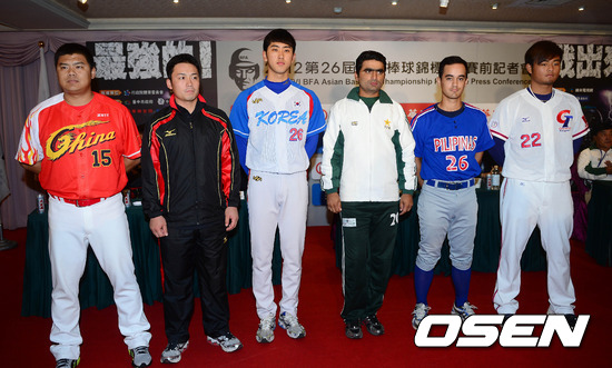 27일 오후 대만 타이중 시내의 한 호텔에서 열린 아시아야구선수권대회 기자회견에서 한국 대표팀 김민수를 비롯한 각 나라 선수들이 기념촬영을 하고 있다.
