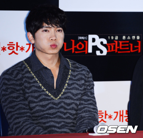 27일 오후 서울 용산 CGV에서 열린 영화 ‘나의 PS 파트너’ 시사회에서 지성이 긴장을 풀며 볼에 바람을 넣고 있다.