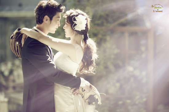 12월 8일 결혼식을 올리는 LG트윈스 내야수 서동욱과 MC 겸 리포터 출신의 주민희가 야구를 콘셉트로 한 재치 만점의 웨딩화보를 공개했다.