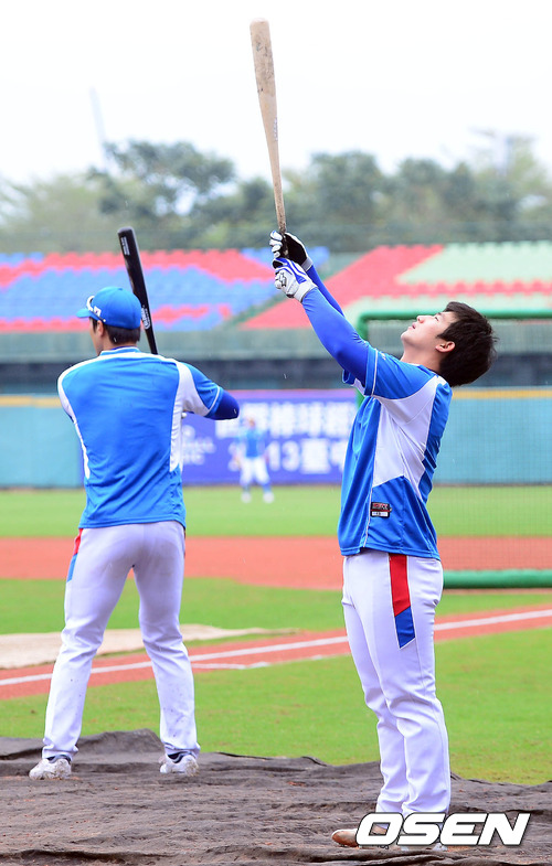 28일 오후 대만 타이중 인터컨티넨탈구장에서 열리는 '제26회 아시아야구선수권대회' 한국과 필리핀의 경기 시작 전 최재훈이 훈련 중 배트로 하늘을 가리키고 있다.