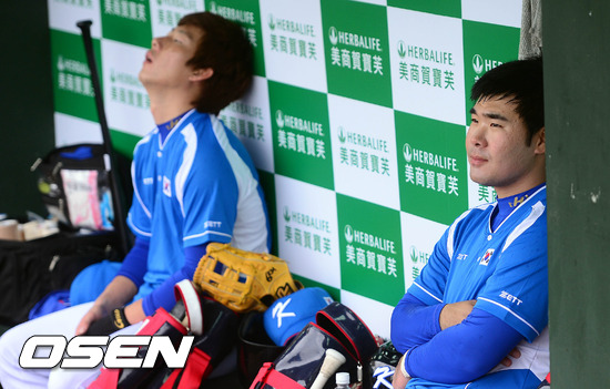28일 오후 대만 타이중 인터컨티넨탈구장에서 열린 '제26회 아시아야구선수권대회' 한국과 필리핀의 경기 시작 전 이재원과 고영민이 덕아웃에 앉아 비가 내리는 그라운드를 바라보고 있다.