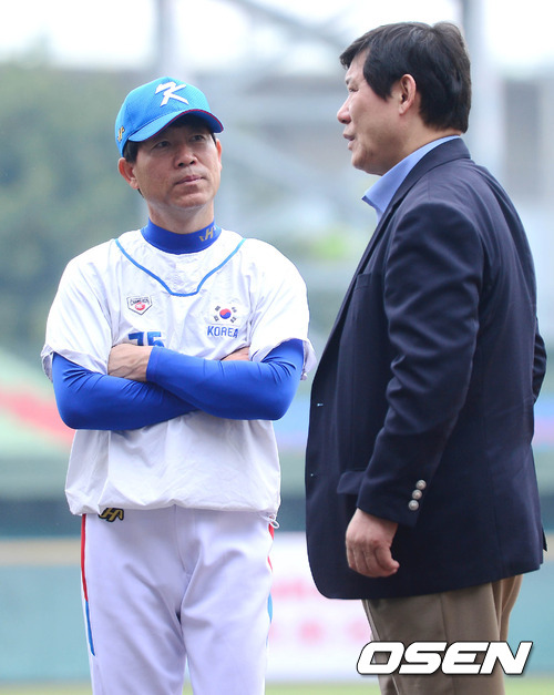 28일 오후 대만 타이중 인터컨티넨탈구장에서 열린 '제26회 아시아야구선수권대회' 한국과 필리핀의 경기 시작 전 이연수 감독과 허구연 해설위원이 이야기를 나누고 있다.