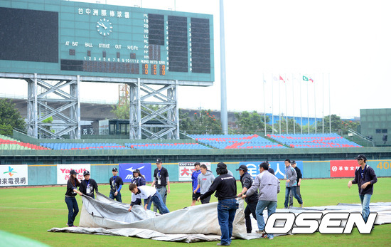 28일 오후 대만 타이중 인터컨티넨탈구장에서 열린 '제26회 아시아야구선수권대회' 한국과 필리핀의 경기 시작 전 비가 내리자 구장 관계자들이 방수포를 덮고 있다.