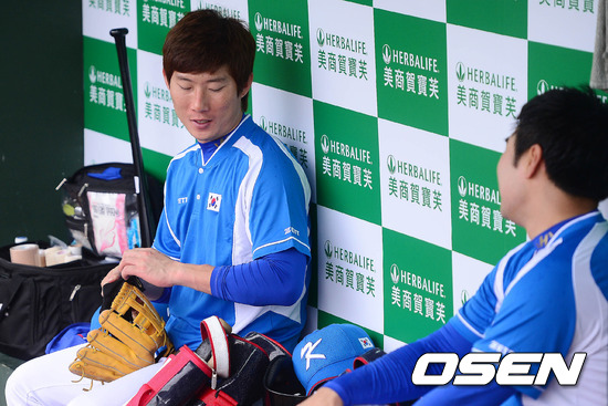 28일 오후 대만 타이중 인터컨티넨탈구장에서 열린 '제26회 아시아야구선수권대회' 한국과 필리핀의 경기 시작 전 고영민과 이재원이 이야기를 나누고 있다.
