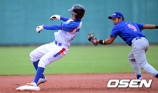 28일 오후 대만 타이중 인터컨티넨탈구장에서 열린 '제26회 아시아야구선수권대회' 한국과 필리핀의 경기 1회말 무사 1루 오선진의 타석 정훈이 도루에 성공하고 있다.