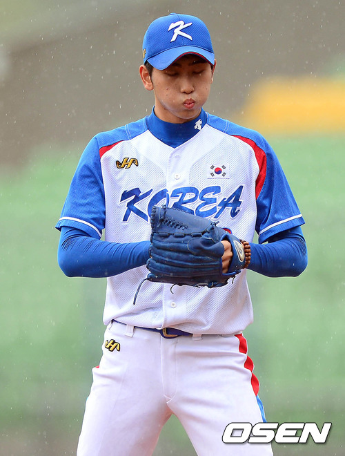 28일 오후 대만 타이중 인터컨티넨탈구장에서 열린 '제26회 아시아야구선수권대회' 한국과 필리핀의 경기 2회초 필리핀에게 3실점을 허용한 김민수가 마운드에 서 있다.