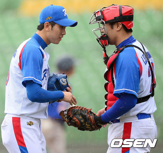 28일 오후 대만 타이중 인터컨티넨탈구장에서 열린 '제26회 아시아야구선수권대회' 한국과 필리핀의 경기 2회초 2사 김민수가 강판당하며, 공을 이재원에게 건내고 있다.