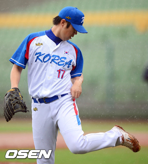 28일 오후 대만 타이중 인터컨티넨탈구장에서 열린 '제26회 아시아야구선수권대회' 한국과 필리핀의 경기 2회초를 마친 윤근영이 덕아웃으로 향하며 진흙이 묻은 스파이크를 바라바고 있다.