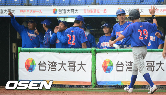 28일 오후 대만 타이중 인터컨티넨탈구장에서 열린 '제26회 아시아야구선수권대회' 한국과 필리핀의 경기 2회초 선취득점을 한 필리핀 선수들이 환호하고 있다.