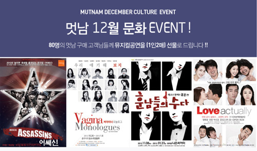 11월 28일부터 12월 26일까지 사이트 내에서 상품을 구입하면 가격에 상관없이 뮤지컬 초대권을 받을 수 있는 기회가 제공된다. 이번 이벤트에는 ‘어쌔신’, ‘버자이너 모놀로그’, ‘훈남들의 수다’, ‘러브 액츄얼리’ 총 4개의 공연이 준비 돼 있다.