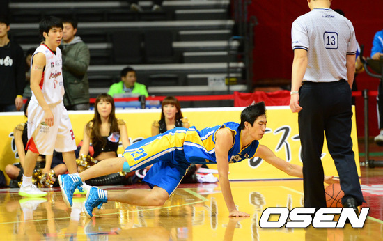 28일 오후 경기 고양시 고양실내체육관에서 열린 '2012 KB국민카드 프로-아마 최강전' 서울 SK와 연세대의 경기, 1쿼터 연세대 최승욱이 루즈볼을 잡으려 몸을 날리고 있다.