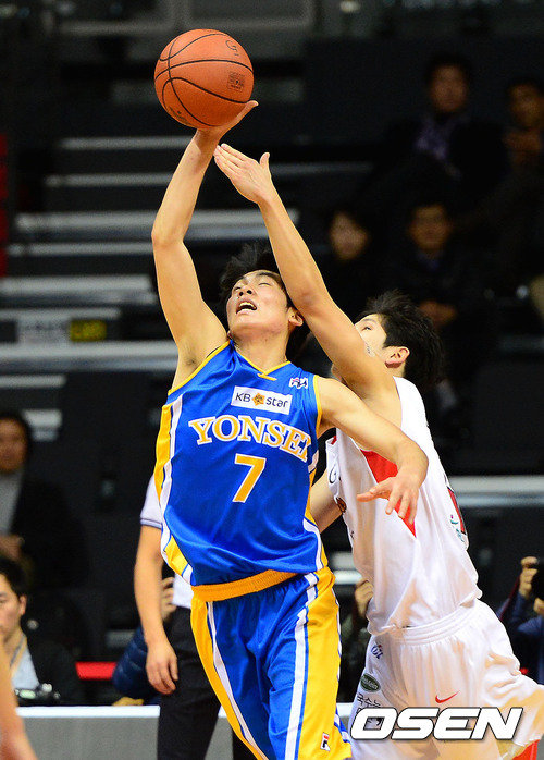 28일 오후 경기 고양시 고양실내체육관에서 열린 '2012 KB국민카드 프로-아마 최강전' 서울 SK와 연세대의 경기, 2쿼터 연세대 천기범이 루즈볼을 잡으려 하고 있다.
