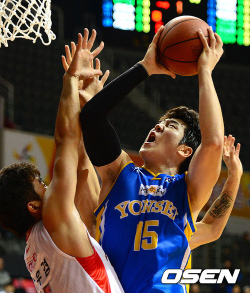 28일 오후 경기 고양시 고양실내체육관에서 열린 '2012 KB국민카드 프로-아마 최강전' 서울 SK와 연세대의 경기, 2쿼터 연세대 김준일이 SK 수비진을 돌파하고 있다.