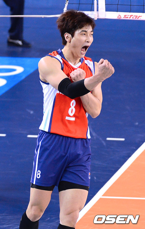 2세트 대한항공 김학민이 강타 성공후 주먹을 쥐며 환호하고 있다
