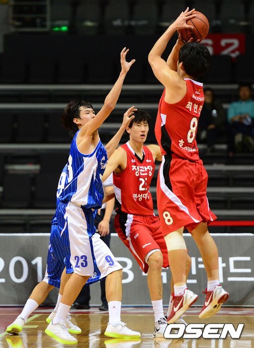 28일 오후 경기 고양시 고양실내체육관에서 열린 '2012 KB국민카드 프로-아마 최강전' 안양 KGC와 중앙대의 경기, 3쿼터 중앙대 전성현이 KGC 최현민을 블록슛하고 있다.