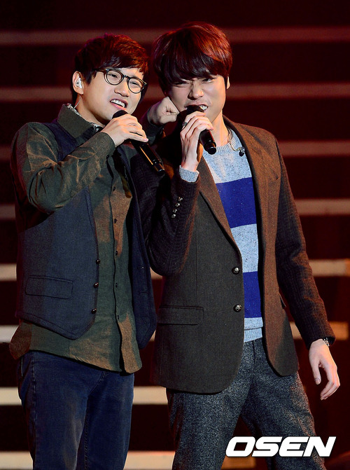 28일 오후 서울 방이동 올림픽공원 내 SK 핸드볼경기장에서 열린 MBC 라디오 'DJ 콘서트 2012'에서 스윗소로우 김영우와 송우진이 장난을 치고 있다.
