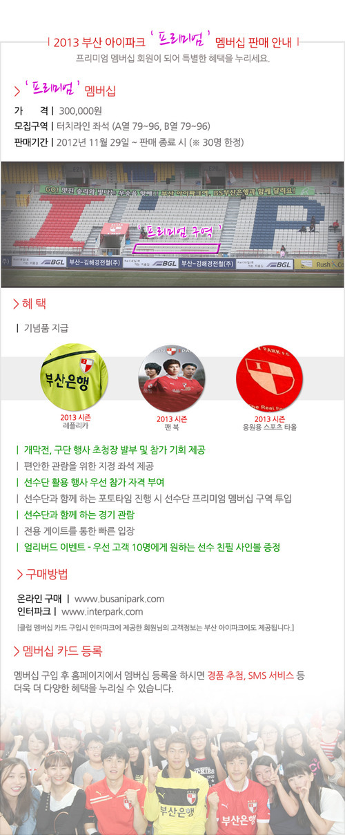 특별한 30명을 위한 2013 프리미엄 멤버십 회원 신청은 오후 12시부터 부산 아이파크와 인터파크 홈페이지를 통해 예약가능하며, 오후 7시 30분부터 진행되는 부산과 울산의 현대 오일뱅크 K리그 43라운드 경기 현장에서도 예약 가능하다.