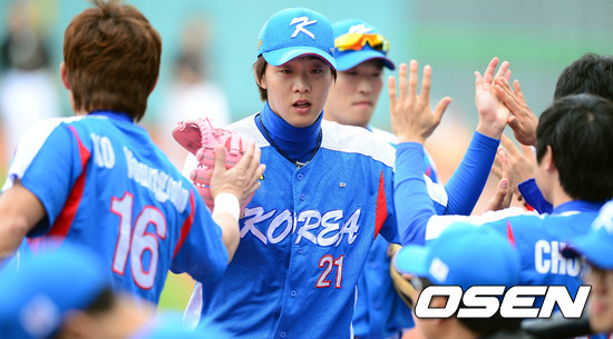 29일 오후 대만 타이중 인터컨티넨탈구장에서 열린 '제26회 아시아야구선수권대회' 한국과 중국의 경기 5회말까지 무실점을 이어가고 있는 정인욱이 덕아웃에서 동료들과 하이파이브를 하고 있다.