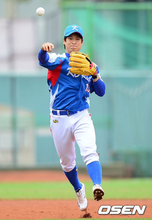 29일 오후 대만 타이중 인터컨티넨탈구장에서 열린 '제26회 아시아야구선수권대회' 한국과 중국의 경기 8회말 중국 선두타자의 땅볼을 최윤석이 잡아 1루로 송구하고 있다.