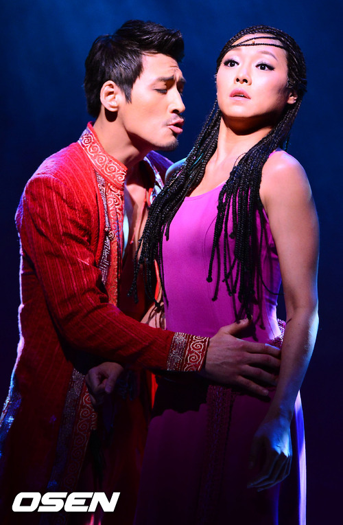29일 오후 서울 구로구 신도림동 디큐브아트센터에서 열린 뮤지컬 아이다의 프레스 리허설에서 아이다 역의 차지현과와 라다메스 장군 역의 김준현이 화려한 무대를 선보이고 있다.