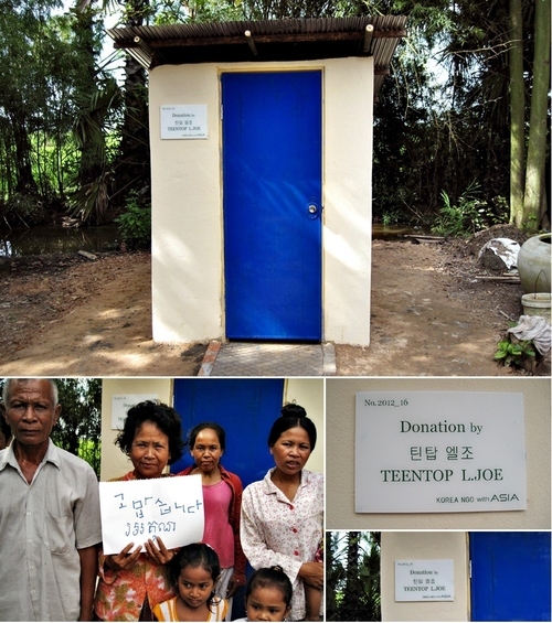 사진에는 틴탑 엘조의 이름이 새겨진 명판이 걸려있는 화장실과 서투르지만 정성스레 적은 ‘고맙습니다’ 라는 메시지를 들고 있는 현지 주민들의 모습이 담겨있다.