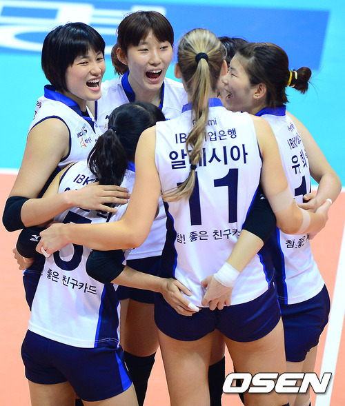 기업은행은 29일 대전충무체육관에서 열린 ‘NH농협 2012-2013 V-리그’ 여자부 KGC인삼공사와의 경기에서 알레시아 김희진 박정아로 이어지는 리그 최고의 공격 트리오를 앞세워 3-0(28-26 25-14 25-23)으로 이겼다. 6승1패(승점 17점)을 기록한 기업은행은 이날 경기가 없었던 GS칼텍스(5승1패, 승점 15점)를 끌어내리고 여자부 선두로 치고 나갔다.