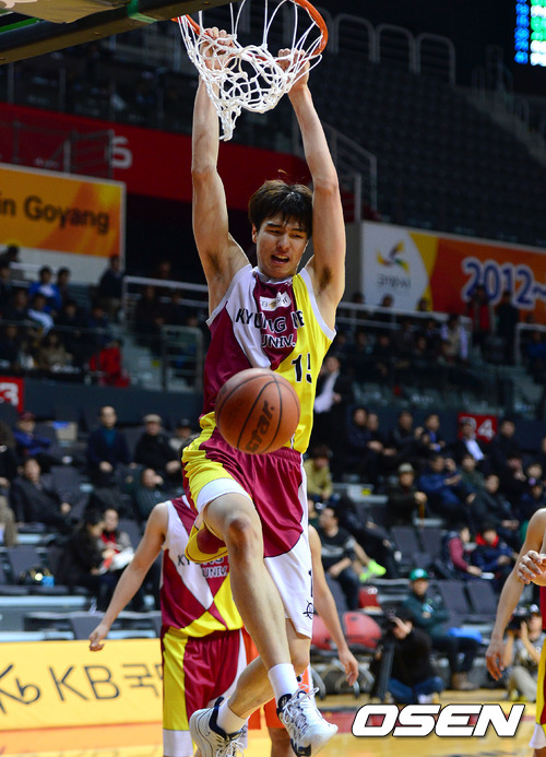 29일 오후 경기 고양시 고양실내체육관에서 열린 '2012 KB국민카드 프로-아마 최강전' 인천 전자랜드와 경희대의 경기, 4쿼터 경희대 김종규가 투핸드 덩크슛을 시도하고 있다.