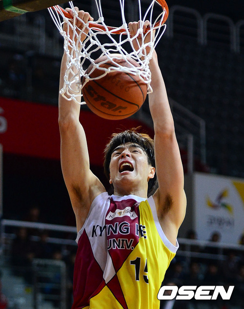 29일 오후 경기 고양시 고양실내체육관에서 열린 '2012 KB국민카드 프로-아마 최강전' 인천 전자랜드와 경희대의 경기, 4쿼터 경희대 김종규가 투핸드 덩크슛을 시도하고 있다.