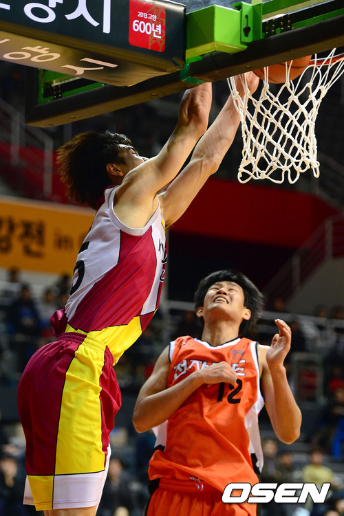 29일 오후 경기 고양시 고양실내체육관에서 열린 '2012 KB국민카드 프로-아마 최강전' 인천 전자랜드와 경희대의 경기, 4쿼터 경희대 김종규가 투핸드 덩크슛을 시도하고 있다.