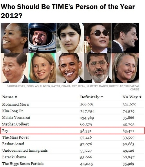 29일 미국의 시사주간지 타임의 공식홈페이지에 따르면 싸이가 38명의 인물 중 이날 오후 6시 기준, 5만 8331표를 얻어 5위를 기록 중이다. 싸이는 타임지가 올해의 인물 후보를 공개한 직후인 지난 27일 기록한 순위인 13위보다 8계단 상승한 수치다.