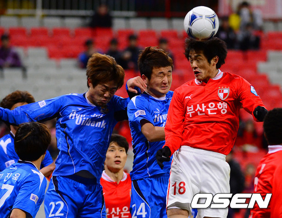 29일 오후 부산 아시아드주경기장에서 열린 현대오일뱅크 K리그 2012 그룹A 부산 아이파크와 울산 현대의 경기 전반 부산 박용호가 헤딩슛을 시도하고 있다