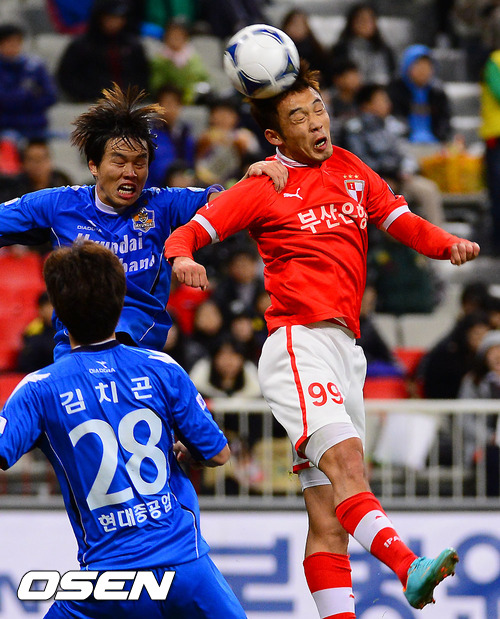 29일 오후 부산 아시아드주경기장에서 열린 현대오일뱅크 K리그 2012 그룹A 부산 아이파크와 울산 현대의 경기 전반 부산 박용호가 헤딩슛을 시도하고 있다.